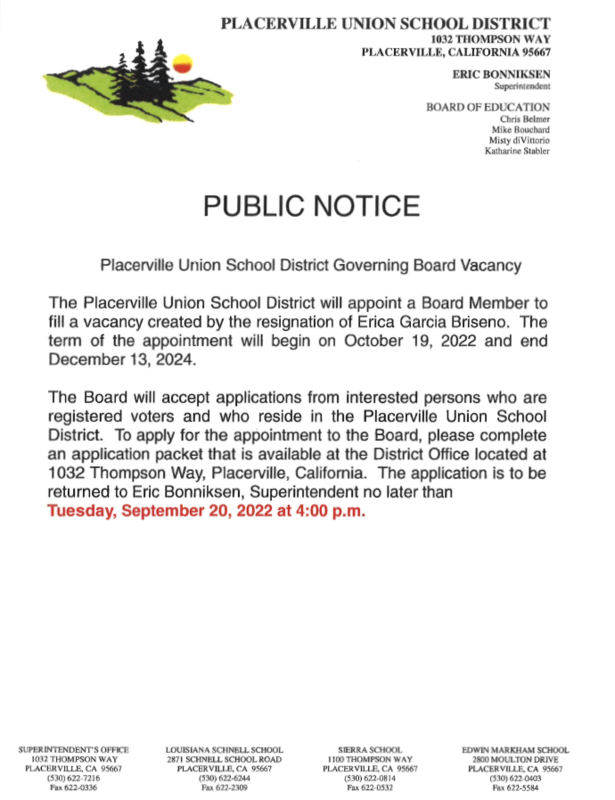 Placerville Union School District Governing Board Vacancy